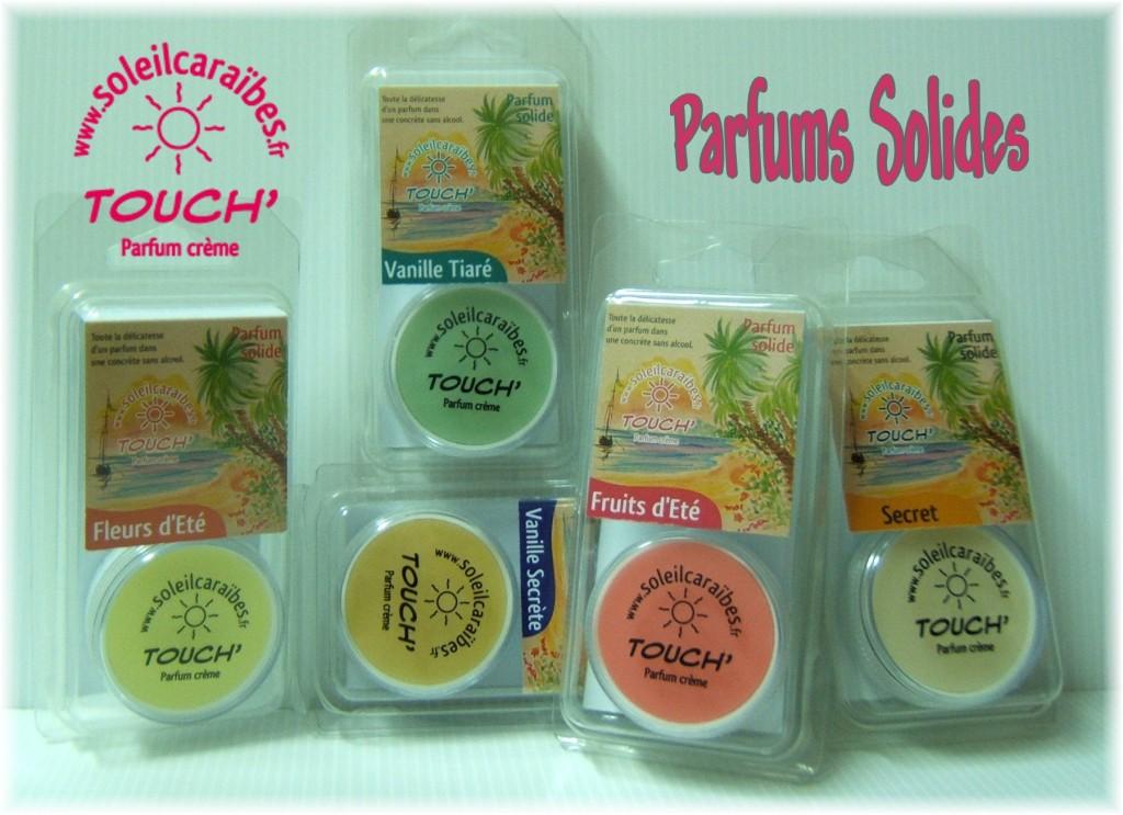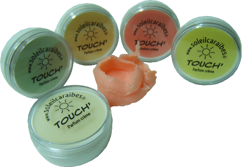 Les parfums solides TOUCH' Soleil Caraïbes  sont de savants mélanges de  produits naturels : Beurre de karité, cire d'abeille, huile de jojoba pour la base, puis les fragrances et dans certains un colorant naturel.